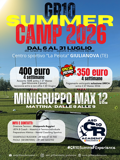 Il GR10 Summer Camp è molto più di un semplice camp estivo: è un’esperienza formativa completa dedicata ai giovani calciatori che vogliono migliorare realmente le proprie capacità tecniche, mentali e sportive in un ambiente professionale, stimolante e divertente.